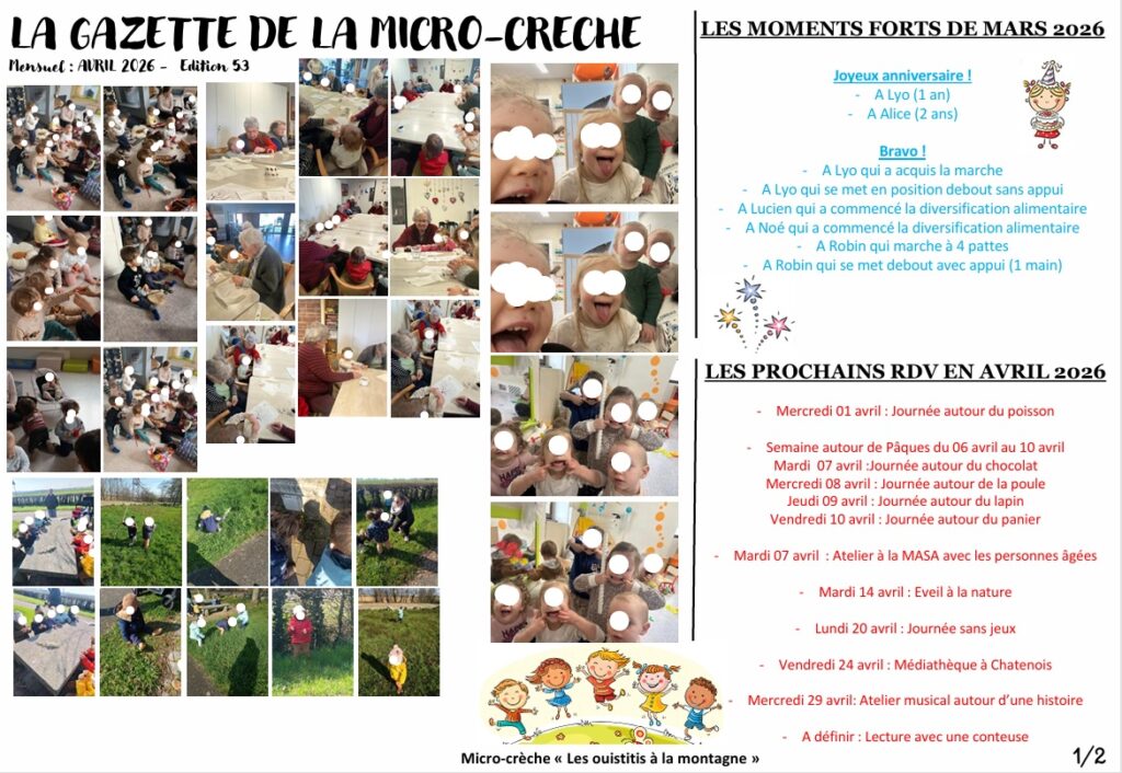 Nouveau mois, la nouvelle gazette voit le jour. Venez découvrir la nouvelle gazette du mois d’avril 2026 le thème « L’acquisition du langage» ainsi que les exploits du mois de mars 2026. Pleins de nouvelles aventures et découvertes pour ce mois.