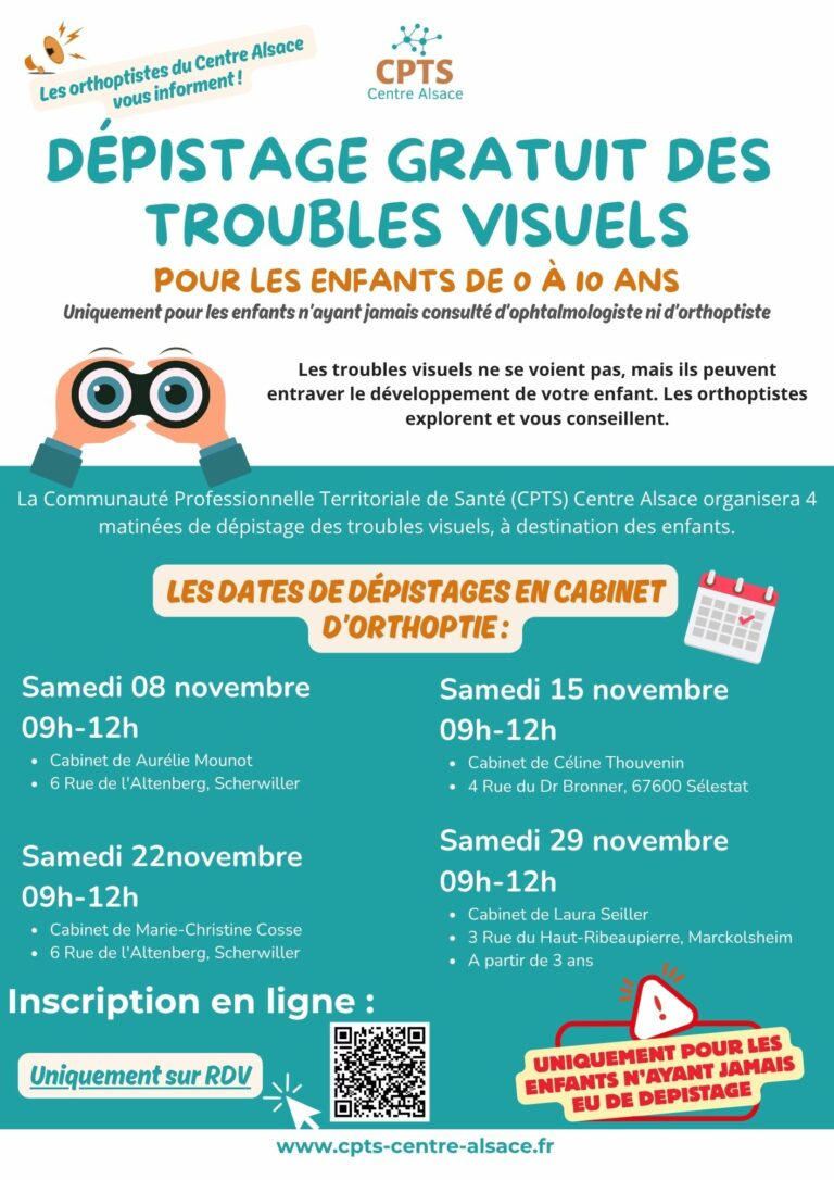 Dans le cadre des actions de prévention en santé visuelle de la CPTS Centre Alsace, nous organisons des sessions de dépistage visuel pour les enfants de 0 à 10 ans n’ayant jamais eu de dépistage. Ces séances de dépistages se tiendront les samedis matin du mois de novembre dans les