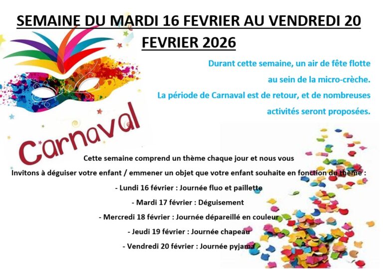 Du mardi 04 mars au vendredi 07 mars 2025 Mardi 04 mars : Déguisement / Carnaval Mercredi 05 mars : Journée pyjama Jeudi 06 mars : Journée chapeau Vendredi 07 mars : Musique